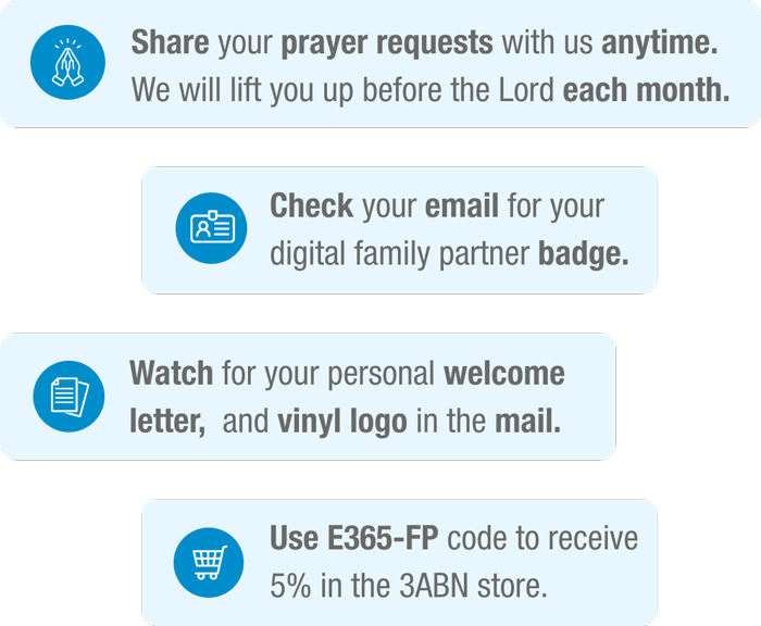 Thank you for becoming a 3ABN Evangelism 365 Family Partner. Because of your faithfulness, the everlasting gospel will continue to shine around the worldβevery day, every soul, every nation.